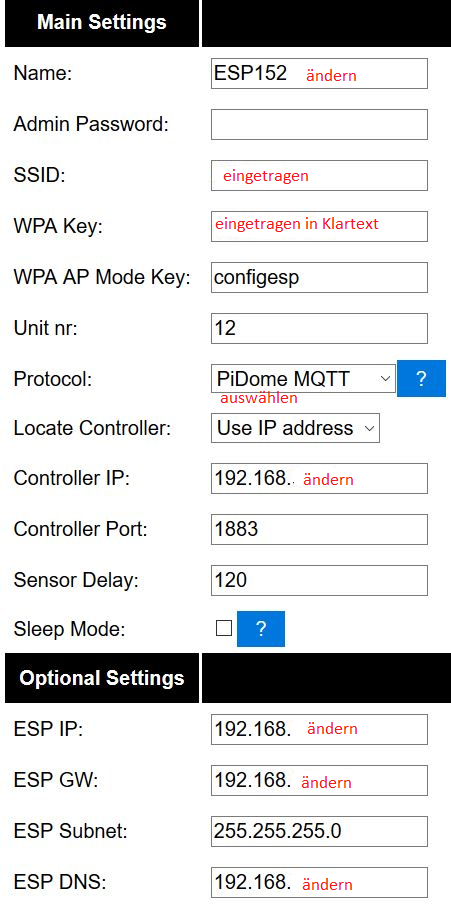 Nach dem Flashen meldet sich der ESP mit einem WLAN-AP (ESP_xx) und mit configesp kann man sein Handy/PC direkt verbinden zum erstmaligen Setup. Dazu ruft man die Webseite des ESPs auf mit dem verbundenen Gerät http://192.168.4.1